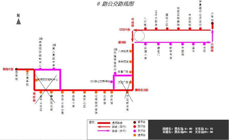 1.走向調(diào)整:“西車場(chǎng)”—渤海大街—平安路—中心街—“西市公安分局”—原線—“游泳館”—體育館路—渤海大街—市府路—“財(cái)富廣場(chǎng)”—原線—“火車站”。
